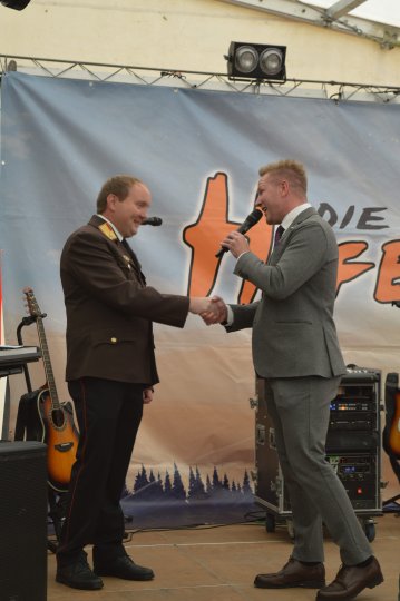 Nach Abschluss des Festaktes konnte das Fahrzeug besichtigt werden, bevor vom formellen Programm in den Frühschoppen mit einer musikalischen Darbietung der „Hafendorfer“ übergeleitet wurde. Auch eine Feuerwehr-Hüpfburg für die kleinen Besucher fehlte dabei nicht.