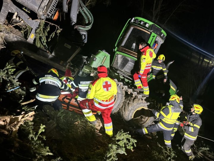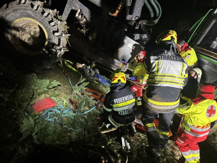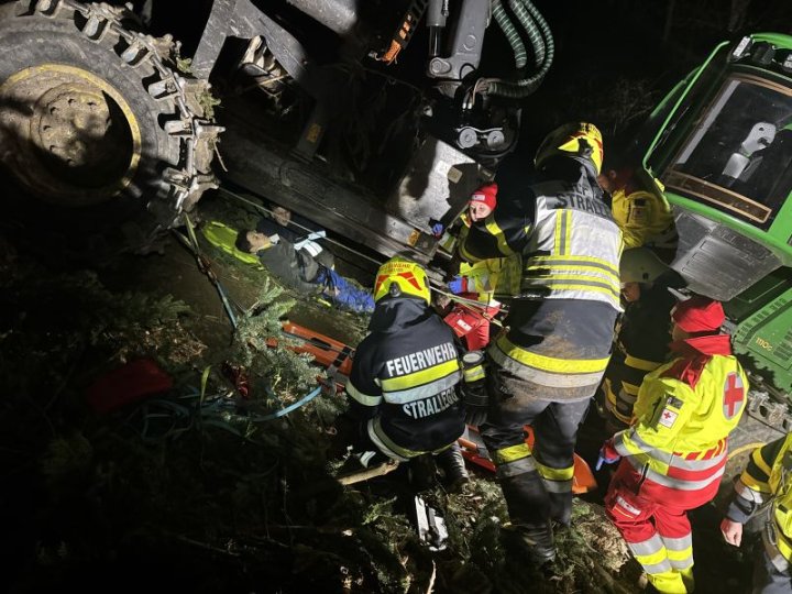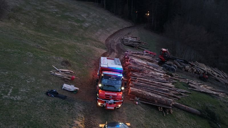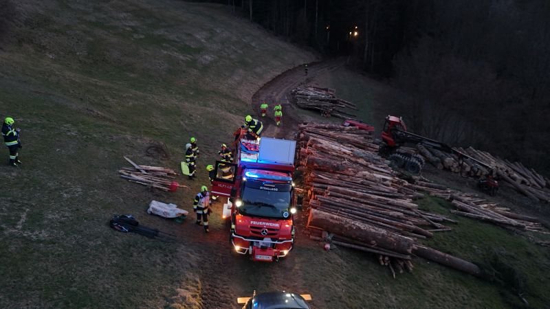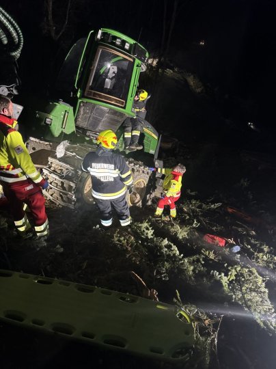 Person unter dem Forwarder aufgefunden. Das machte eine neue Beurteilung der Lage notwendig und so wurde die schwer Verletzte Person unter der Forstmaschine in Zusammenarbeit mit dem Roten Kreuz der Ortsstelle Birkfeld zuerst gerettet und mittels Spineboard und Korbtrage aus dem steilen Waldgebiet abtransportiert.